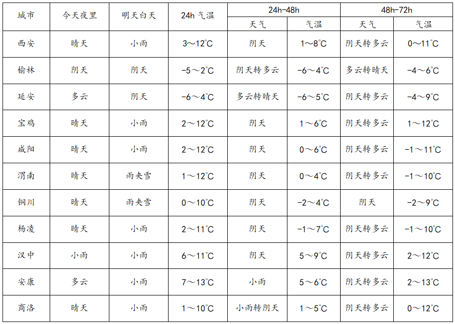 明天白天:全省多云转阴天。延安南部局地、关中北部有雨夹雪或小雪(0~2.5毫米),秦巴山区有小到中雪(3~4毫米),巴山局地有冻雨。关中南部、陕南有小雨或雨夹雪(0~5毫米),陕南南部局地有中雨(6~15毫米)。陕北大部、关中北部和秦岭山区有4级(5.5~7.9米/秒)左右偏北风,阵风可达6级(10.8~13.8米/秒)以上。日平均气温全省大部下降4~6℃,关中、秦岭山区和陕南东部下降6~8℃,局地可达10℃以上。