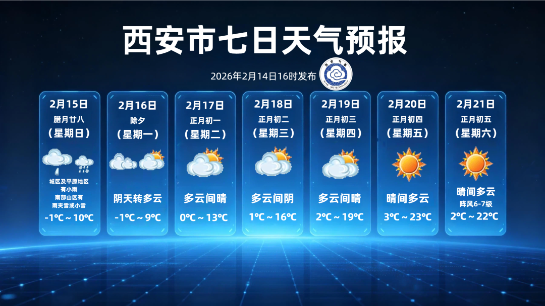 受冷空气和短波槽影响,预计明天白天西安城区及平原地区有小雨,南部山区有雨夹雪或小雪,最高气温下降至10℃左右;16日(除夕)云量较多,以阴天为主;后期17日(初一)至21日(初五)以晴到多云天气为主。最高气温稳步回升,20日(初四)最高气温将攀升至23℃左右;22日(初六)至23日(初七)有一次弱冷空气,云量增加,西安全市以阴天为主,最高气温有所下降。